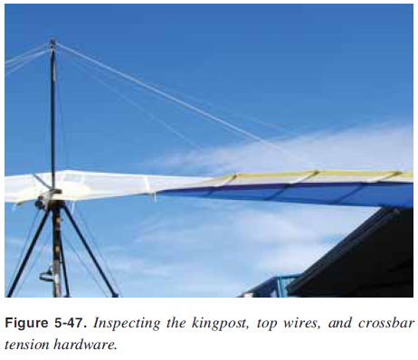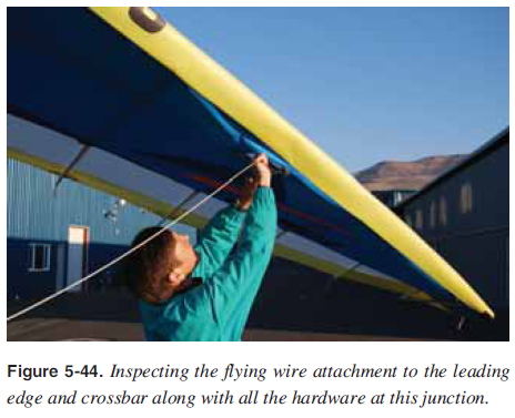 Inspect the left side fl ying wire attachment to the control bar bracket and condition of the fl ying wire up to the wing attachment. Examine the fl ying wire attachment to the leading edge and crossbar, as well as all hardware at this crossbar and leading edge junction. [Figure 5-44] Inspect the condition of the crossbar and the leading edge from the nose to the tip. Any discrepancies or tears in the leading edge fabric must lead to more detailed investigation of the leading edge spar itself.
