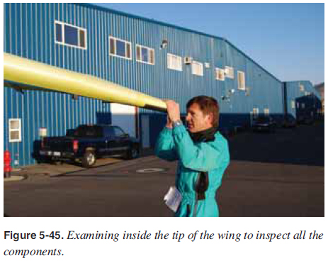 Inspect the tip area, including the washout strut and general condition of the tip. If it is a double surface wing, look inside the tip and examine the inside of the wing and its components. [Figure 5-45]