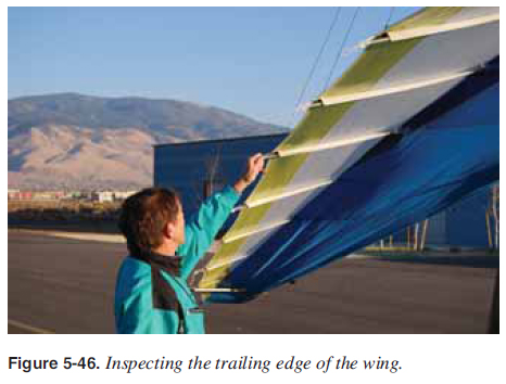 Move along the trailing edge of the wing, inspecting the condition of the trailing edge and the tip batten attachments back to the keel. [Figure 5-46] Inspect the sail material, top and bottom, on the wing. Note that the trailing edge is vulnerable to rocks fl ying up from the wheels and hitting the propeller. Therefore, it is especially important to inspect the trailing edge in detail before each fl ight.