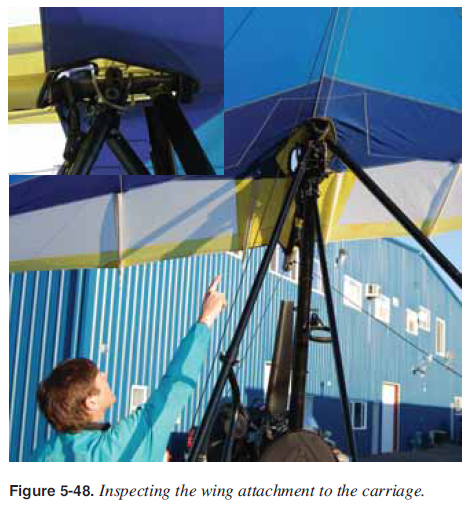 At the aft keel area in the middle of wing, inspect the kingpost and all the condition of the wires from the kingpost to ensure they are not wrapped around the trailing edge battens. [Figure 5-47] Inspect the wing tensioning hardware where the crossbar tensioning cables attach to the rear of the keel. Repeat this same sequence for the right (or opposite) side of the wing, in the reverse order. Inspect the condition of the wing attachment to the carriage, including the backup cable. [Figure 5-48]