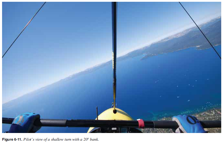 Shallow turns are accomplished by moving the control bar to the side slightly, waiting for the wing to roll the desired amount, and then releasing the side pressure on the control bar back to the center position. The WSC aircraft will stabilize in the turn with no control pressures required. During a shallow turn there is no signifi cant increase in airspeed or G forces that can easily be noticed by the student. [Figure 6-11] Once a shallow turn is initiated, it is a good practice to be stabilized at a constant bank and then exit to a predetermined heading. To exit the shallow turn, opposite sideways pressure must be put on the control bar to bring the WSC aircraft back to level fl ight.