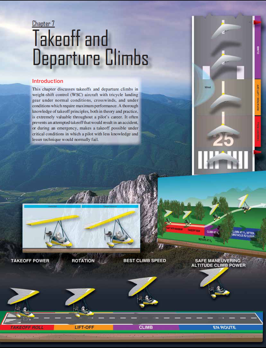 The takeoff, though relatively simple, often presents the most hazards of any part of a fl ight. The importance of thorough knowledge, faultless technique, and sound judgment cannot be overemphasized. It must be remembered that the manufacturer’s recommended procedures, including confi guration and airspeeds, and other information relevant to takeoffs and departure climbs in a specifi c make and model WSC aircraft are contained in the Airplane Flight Manual/Pilot’s Operating Handbook (AFM/POH). If any of the information in this chapter differs from the manufacturer’s recommendations as contained in the AFM/POH, the manufacturer’s recommendations take precedence. |