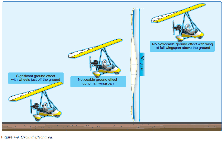 Ground Effect on Takeoff Ground effect is a condition of improved performance encountered when the aircraft is operating very close to the ground. Ground effect can be detected and measured up to an altitude of about one wingspan above the surface. [Figure 7-9] However, ground effect is most signifi cant when the WSC aircraft is maintaining a constant attitude at low airspeed and low altitude. Examples are during takeoff when the aircraft lifts off and accelerates to climb speed, and also during the landing fl are before touchdown. When the wing is under the infl uence of ground effect, there is a reduction in upwash, downwash, and wingtip vortices.