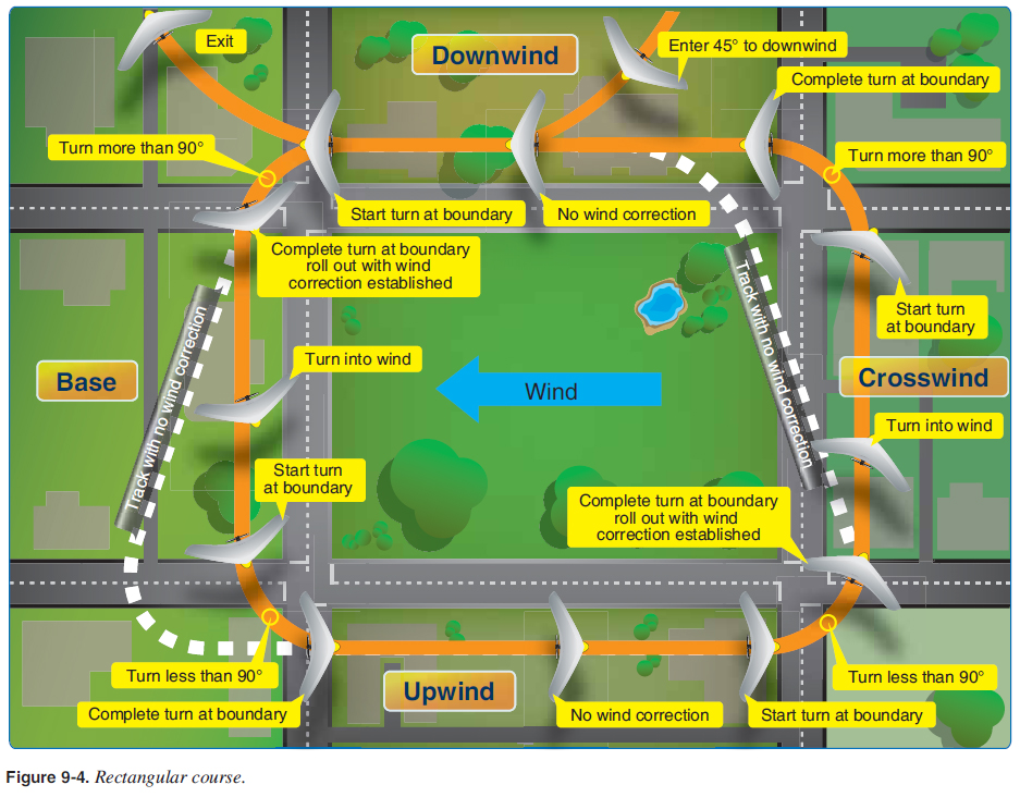 Rectangular Course Normally, the fi rst ground reference maneuver introduced to the pilot is the rectangular course. Reference Figure 9-4 throughout this rectangular course section. The rectangular course is a training maneuver in which the ground track of the aircraft is equidistant from all sides of a selected rectangular area on the ground. The maneuver simulates the conditions encountered in an airport traffi c pattern. While performing the maneuver, the altitude and airspeed should be held constant.