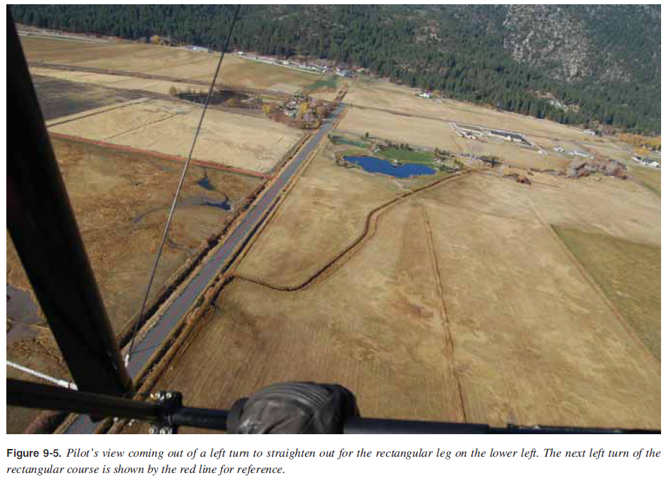 While the aircraft is on the upwind leg, the next fi eld boundary should be observed as it is being approached to plan the turn onto the crosswind leg. Since the wind is a headwind on this leg, it reduces the aircraft’s groundspeed and tries to drift the aircraft toward the fi eld during the turn onto the crosswind leg. For this reason, the roll-in to the turn must be slow and the bank relatively shallow to counteract this effect. As the turn progresses, the headwind component decreases, allowing the groundspeed to increase. Consequently, the bank angle and rate of turn are increased gradually to assure that upon completion of the turn, the crosswind ground track continues the same distance from the edge of the fi eld. Completion of the turn with the wings level should be accomplished at a point aligned with the upwind corner of the fi eld. As the wings are rolled level, the proper drift correction is established with the aircraft turned into the wind with a change in heading of less than 90°. If the turn has been made properly, the fi eld boundary will again be the same distance as it was in the previous legs. While on the crosswind leg, the wind correction angle should be adjusted as necessary to maintain a uniform distance from the fi eld boundary. As the next fi eld boundary is being approached, the pilot should plan the turn onto the downwind leg. Since a wind correction angle is being held into the wind and away from the fi eld while on the crosswind leg, this next turn requires a turn of more than 90°. Since the crosswind becomes a tailwind, causing the groundspeed to increase during this turn, the bank initially should be medium and progressively increased as the turn proceeds. To complete the turn, the rollout must be timed so that the wings become level at a point aligned with the crosswind corner of the fi eld just as the longitudinal axis of the aircraft again becomes parallel to the fi eld boundary. The distance from the fi eld boundary should be the same as from the other sides of the fi eld. Usually, drift should not be encountered on the upwind or the downwind leg, but it may be diffi cult to fi nd a situation where the wind is blowing exactly parallel to the fi eld boundaries. This would make it necessary to use a slight wind correction angle on all the legs. It is important to anticipate the turns to correct for groundspeed, drift, and turning radius. When the wind is behind the aircraft, the turn must be faster and steeper; when it is ahead of the aircraft, the turn must be slower and shallower. These same techniques apply while fl ying in airport traffi c patterns. Common errors in the performance of rectangular courses are: