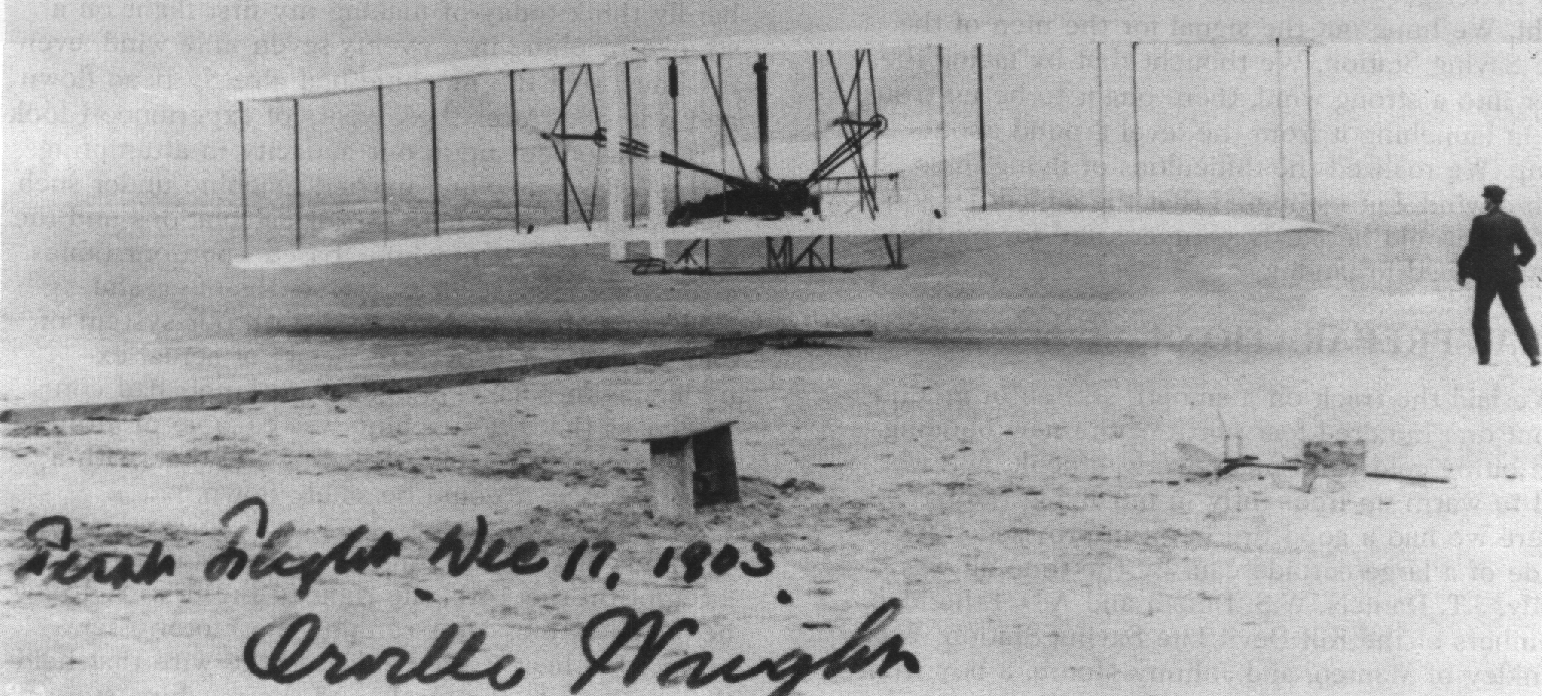 The first manned flight in history: December 17, 1903. At 10:35 am, Orville Wright takes off into a 27 mph wind. The distance covered was 120 feet: time aloft was 12 seconds. Wilbur is seen at right, Picture was taken with Orville's camera by John T. Daniels.