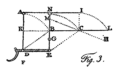 A third principle upon which the leverage of a surface may be prevented is by giving it a motion parallel to itself, either directly up and down, or obliquely so. The surface A I, fig. 3, may be moved perpendicularly, by the shaft which supports it, down to the position K C: or, if it be supported upon two shafts with hinges at D and E, it may be moved obliquely parallel to itself into the position B L.