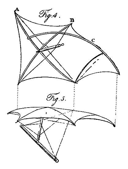 Fig. 4 represents the shape of the cloth, with a perspective view of the poles upon which it is stretched with perfect tightness. Upon the point where the rods A and B intersect is erected an oval shaft; embracing the two cross poles by a slender iron fork; for the purpose of preserving their strength uninjured by boring. To this shaft are braced the ends of the pole B, so as to give this pole any required degree of curvature. The pole A is strung like a common bow to the same curve as the pole B; and is only connected with the upright shaft by what may be called a check brace; which will allow the hinder end of this pole to heel back to a certain extent, but not the fore end. The short brace producing this effect is shown in fig. 4. Fig. 5 exhibits the fellow wing to that represented in fig. 4, erected upon a beam, to which it is so braced, as to convert the whole length of it into a hinge. The four braces coming from the ends of this beam are shown: two of them terminate near the top of the centre of the other shaft; the others are inserted into the point C, fig. 4, of the bending rod. A slight bow, not more than threeeighths of an inch thick, properly curved by its string, and inserted between the hinder end of the pole A, and the curved pole C, completes the wing.