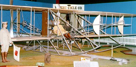 This airplane is an exact reproduction of the Wright 1909 Military Flyer. Upon being purchased by the Signal Corps for $30,000 on August 2, 1909, the original airplane was redesignated Signal Corps Airplane No. 1, the world's first military heavier-than-air flying machine. It was used in October 1909 for giving flight instructions to Lts. Frank P. Lahm and Frederic E. Humphreys, and in 1910 it was used by Lt. Benjamin D. Foulois to teach himself how to fly. By March 1911, the airplane was no longer fit for use and was retired. It is now on exhibit at the Smithsonian Institution, Washington D.C. This reproduction was constructed in 1955 by personnel of the U.S. Air Force Museum. It is equipped with an engine donated by Mr. Orville Wright and chains, sprockets, and propellers donated by the heirs of the Wright estate. |