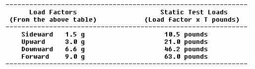 * When equipment mounting is located externally to one side, or forward of occupants, a forward load factor of 2.0 g is sufficient. ** Due to differences among various aircraft designs in flight and ground load factors, contact the aircraft manufacturer for the load factors required for a given model and location. In lieu of specific information, the factors used for FAR 23 utility category are acceptable for aircraft with never exceed speed of 250 knots or less and the factors used for FAR 23 acrobatic category for all other transport aircraft. The following is an example of determining the static test loads for