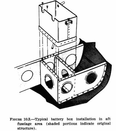 b. Protection from Engine Heat. The installation should protect the battery from extreme engine heat, which would be detrimental to the battery's service life and reliability. Such protection should provide for the temperatures encountered after engine shutdown as well as during engine operation. When locating the battery within the engine compartment, choose a location that will not interfere with the flow of engine cooling air. c. Protection from Mechanical Damage. Vibration and other shock loads are a major cause of short battery life. Whenever possible install the battery in a manner or location that will minimize damage from airframe vibration and prevent accidental damage by passengers or cargo. d. Passenger Protection. Enclose the battery in a box or other suitable structure to protect passengers from any fumes or electrolyte that may be spilled as a result of battery overheating, minor crash, inverted flight, and/or rapid decompression if the battery is located within the aircraft's pressure vessel. e. Airframe Protection. Protect the airframe structure and fluid lines by applying asphaltic or rubber-base paint to the areas adjacent to and below the battery or battery box. Apply paralketone, heavy grease, or other comparable protective coating to control cables in the vicinity of the battery or battery box. Damage to adjacent fabric covering and electrical equipment can be minimized by providing a battery sump jar containing a neutralizing agent, properly locating battery drains and vent discharge lines, and adequately venting the battery compartment. 178. DUPLICATION OF THE MANUFACTURER'S INSTALLATION. The availability of ready made parts and attachment fittings may make it desirable to consider the location and type of installation selected and designed by the airframe manufacturer. Appreciable savings in time and work may be realized if previously approved data and/or parts are used. 179. OTHER INSTALLATIONS. If the battery installation has not been previously approved, or if the battery is to be installed or relocated in a manner or location other than provided in previously approved data, perform static tests on the completed installation as outlined in chapter 1 of this handbook. Because of the concentrated mass of the battery, the support structure should also be rigid enough to prevent undue vibration which would lead to early structural failure. Typical illustrations of battery support structure are shown in figures 10.1 thru 10.4. {See Figure 10.2} {See Figure 10.3} 180. - 185. [RESERVED] Section 2. INSTALLATION 186. SECURING THE BATTERY. Install the battery box or hold-downs in such a manner as to hold the battery securely in place without subjecting it to excessive localized pressure which may distort or crack the battery case. Use rubber or wooden blocks protected with paraffin or asphaltic paint as spacers within the battery box, as necessary, to prevent shifting of the battery and possible shorting of the battery terminals or cables. Also, provide adequate clearance between the battery and any bolts and/or rivets which may protrude into the battery box or compartment. 187. VENTING. Provide suitable venting to the battery compartment to prevent the accumulation of the hydrogen gas evolved during operation. For most aircraft batteries, an airflow of 5 cubic feet per minute is sufficient to purge the battery compartment of explosive concentrations of hydrogen. a. Manifold Type. In this type of venting, one or more batteries are connected, via battery or battery box vent nipples, to a hose or tube manifold system as shown in figure 10.5. Fasten such hoses securely to prevent shifting and maintain adequate bend radii to prevent kinking. (1) The upstream side of the system is connected to a positive pressure point on the aircraft, and the downstream side is usually discharged overboard to a negative pressure area. It is advisable to install a battery sump jar in the downstream side to neutralize any corrosive vapors that may be discharged. (2) When selecting these pressure points, select points that will always provide the proper direction of airflow through the manifold system during all normal operating attitudes. Reversals of flow within the vent system should not be permitted when a battery sump jar is installed, as the neutralizing agent in the jar may contaminate the electrolyte within the battery. b. Free Airflow Type. Battery cases or boxes that contain louvers may be installed without an individual vent system, provided: (1) The compartment in which the battery is installed has sufficient airflow to prevent the accumulation of explosive mixtures of hydrogen; (2) Noxious fumes are directed away from occupants; and (3) Suitable precautions are taken to prevent corrosive battery fluids or vapors from damaging surrounding structure, covering, equipment, control cables, wiring, etc. 188. DRAINS. Position battery compartment drains so that they do not allow spillage to come in contact with the aircraft during either ground or flight attitudes. Route the drains so that they have a positive slope without traps. Drains should be at least 1/2" in diameter to prevent clogging. 189. ELECTRICAL INSTALLATION. a. Cables/Connectors. Use cables and/or connectors that are adequately rated for the current demand and are properly installed (See AC 43.13-1A, "Acceptable Methods, Techniques, and Practices - Aircraft Inspection and Repair," chapter 11). It may be necessary to contact the battery manufacturer to determine current value of the battery at the 5 minute discharge rate. Cable size can also be selected by using the same gauge as used on a previously approved production aircraft with the same battery. (1) The cables should be of sufficient length to prevent undue strain on the battery connector or terminals. (2) Clamp and protect cables, including the bus, in a very secure manner. Since these units are not fused, any fault could cause loss of the entire electrical system in a