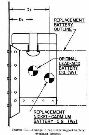 b. Compartments or battery boxes which have previously housed lead-acid batteries must be washed out, neutralized with ammonia or a baking soda solution, allowed to dry thoroughly, and painted with alkaline resistant paint. Remove all traces of sulfuric acid and its corrosion products from the battery vent system to prevent contamination of the potassium hydroxide electrolyte and/or possible damage to the cell case material. Replace those parts of the vent system which cannot be thoroughly cleansed (hoses, etc.). When sump jars are incorporated into the vent system, replace the old pad with a new one that has been saturated in a three percent solution (by weight) of boric acid and water. 203. SECURING THE BATTERY. Follow the procedures outlined in Section 2 of this chapter. Make certain that the hold down bolts are not drawn up so tightly that the battery case/cover becomes distorted. Should the cover become distorted, there is a possibility that the cell terminal hardware may eventually puncture the neoprene cover liner used in many batteries, and short circuit. Caution: In installations where care has been taken to isolate the battery cases, inadvertent grounding may occur through improper or careless use of safety wire. Use no wood in nickel-cadmium battery boxes as it becomes conductive with time causing a current flow from the battery case to ground. Use only fiberglass or other acceptable material as liners and spacers in the battery box. 204. VOLTAGE AND CURRENT REGULATION. It is essential that the charging voltage and current be checked and, if necessary, the voltage regulator reset to meet the requirements of the nickel-cadmium battery being installed. IMPORTANT - improper charging current or voltage can destroy a battery in a short period of time. 205. WEIGHT AND BALANCE. After installation of the nickel-cadmium battery the weight and balance of the aircraft should be recomputed if: a. The weight of the nickel-cadmium battery is different from that of