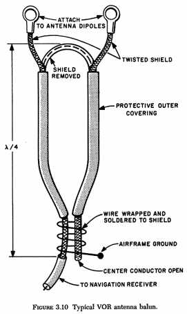 (1) {(2) in original - Ed.} Figure 3.10 is an illustration of a typical VOR antenna balun. A balun made from a section of the transmission line functions as a tuned circuit or transformer which produces a standing wave ratio to provide the desired matching impedance. When the antenna is matched to the line, the line measurement in multiples of wave lengths is not critical.