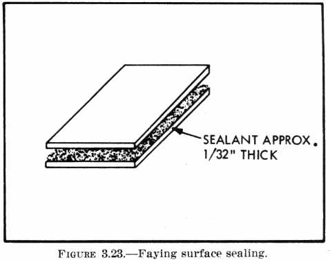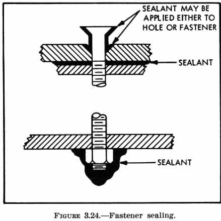 (3) Place the component parts together and install the required fasteners. If permanent fasteners cannot be installed, use temporary fasteners to hold the component parts together until the sealant has cured. Install permanent fasteners with fresh sealant by dipping the fastener in sealant or by filling the fastener hole with sealant. (See figure 3.24.