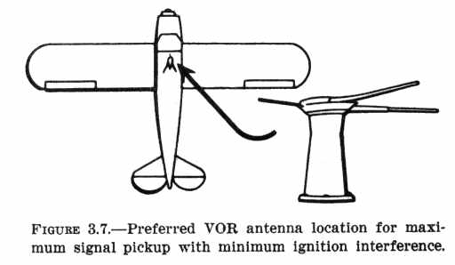 Locate antennas for omnirange (VOR), and instrument landing system (ILS) localizer receivers at a position on the aircraft where they will have the greatest sensitivity for the desired signals and minimum response to undesired signals such as electrical energy radiated by the engine ignition system. A good location for the VOR localizer receiving antenna on many small