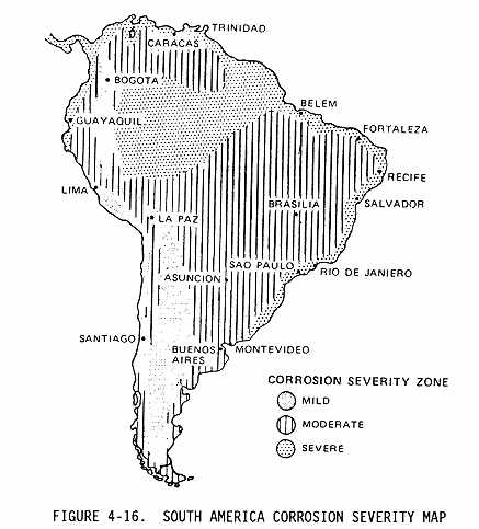 c. The flight routes and bases of operation will expose some airplanes to more corrosive conditions than others. The operational environment of an aircraft may be categorized as mild, moderate, or severe, with respect to the corrosion severity of the operational environment. The corrosion severity of the operational environments around the world are identified in Figure 4-15 through Figure 4-20. The corrosion severity of any particular area may be increased by many factors including: airborne industrial pollutants, chemicals used on runways and taxiways to prevent ice formation, humidity, temperatures, prevailing winds from corrosive environment, etc. {Fig. 4-16, Fig 4-17, Fig 4-18, Fig 4-19}