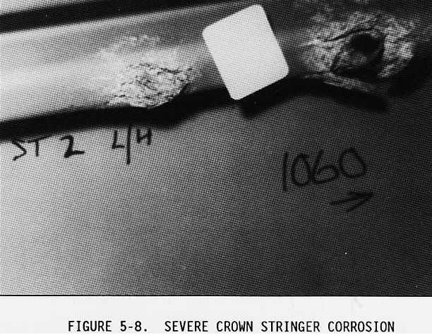 (2) Sometimes the inspection areas are obscured by structural members, equipment installations, or for some other reason are awkward to check visually. Adequate access for inspection must be obtained by removing access panels and adjacent equipment, cleaning the area as necessary, and removing loose or cracked sealants and paints. Mirrors, borescopes, and fiber optics are useful in providing the means of observing obscure areas. Figures 5-10 through 5-18 depict some of these conditions.