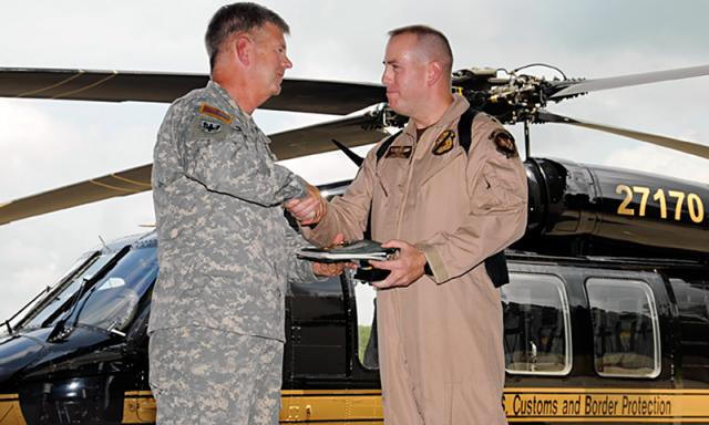 "This is about partnership; in order to be able to provide this great capability, this great aircraft, to our partners in the Department of Homeland Security. What enabled that to happen is a partnership within the Army, the Army pulling together with our brothers in (the Aviation and Missile Command) and (Research, Development and Engineering Command) to procure this aircraft and to modify it to meet the requirements that our Department of Homeland Security so validly needs to execute the tough, very, very difficult mission," said Crosby, who is the Army manager for the Apache helicopter, cargo helicopter, utility helicopter, unmanned aircraft system, armed scout helicopter, and Aviation Systems programs.