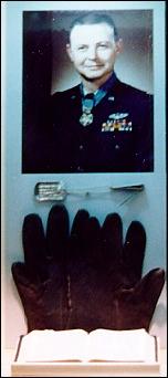After evading a second MiG and then having his F-105 hit once again by flak, the donor spotted two SAM sites and attacked, destroying them both. Only then did he head his battered F-105 for friendly territory. For his valor in combat above and beyond the call of duty, Dethlefsen was awarded the Medal of Honor, the third USAF member to receive the award during the South East Asian (SEA) conflict. The Bible and fingernail clippers on display were carried by the Lt. Col. Dethlefsen on this mission, and he was wearing the gloves and dogtags.