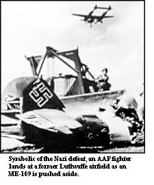 The air offensive conducted by the AAF in conjunction with the RAF against Germany and Italy was of tremendous value in bringing about victory in Europe with the final defeat of these two nations. It was costly, however, for the AAF losses from all causes totaled 27,694 aircraft, including 8,314 heavy bombers, 1,623 medium and light bombers, and 8,481 fighters destroyed in combat.  Total AAF battle casualties were 91,105 personnel 34,362 killed, 13,708 wounded, and 43,035 missing, captured, or interned. Before they could be completed, these new Me 262s were systematically destroyed by the Germans to prevent the Allies from capturing them intact. May9,1945. V-E Day. The war ends in Europe.