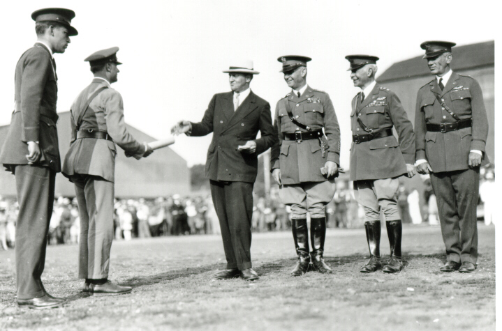 After a monumental flight in the Fokker C-2 Bird of Paradise from Oakland, California, to Hawaii on June 28, 1927, Lieutenants Lester J. Maitland and Albert F. Hegenberger landed at Bolling Field on July 21. Greeted by an enthusiastic crowd and dozens of top officials, the flyers received their citations for the Distinguished Flying Cross (which would be pinned on later when President Coolidge returned from the west coast). "The control of the Eastern Pacific hinges upon the control of Hawaii," said Major General Charles P. Summerall, Chief of Staff of the Army. "The flight has made the reinforcement of the islands from a point on the mainland a matter of assurance and a few hours." The Washington Post summed up the events of the day at Bolling Field: "Like a giant droning bat, their plane came out of the west across the path of the descending sun. Down the field they came, the Army Band playing 'Stars and Stripes Forever'." |