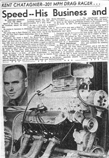 On June 19, 1960, Gulf Freeway Dragstrip Houston, Texas Chatagnier was the worlds first to reach 200+ mph on the 1/4 Mile Run at 201.78 MPH he was driving a supercharged, fuel injected, 430 cubic inch Pontiac  with an engine of 825 Horsepower.