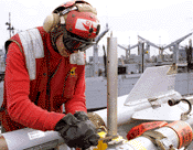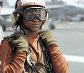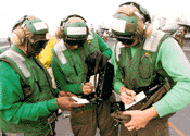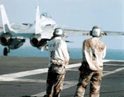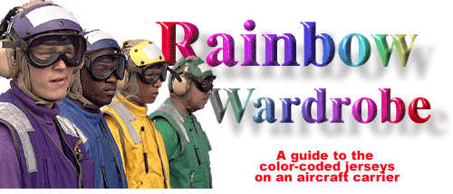 | Much goes into flight operations aboard today's modern Navy aircraft carrier. Preparations for a launch very much resemble a well-choreographed ballet. Those involved in the evolution have specific, clearly-defined roles, and are easily recognizable by the color of their jerseys. | ||||||||||