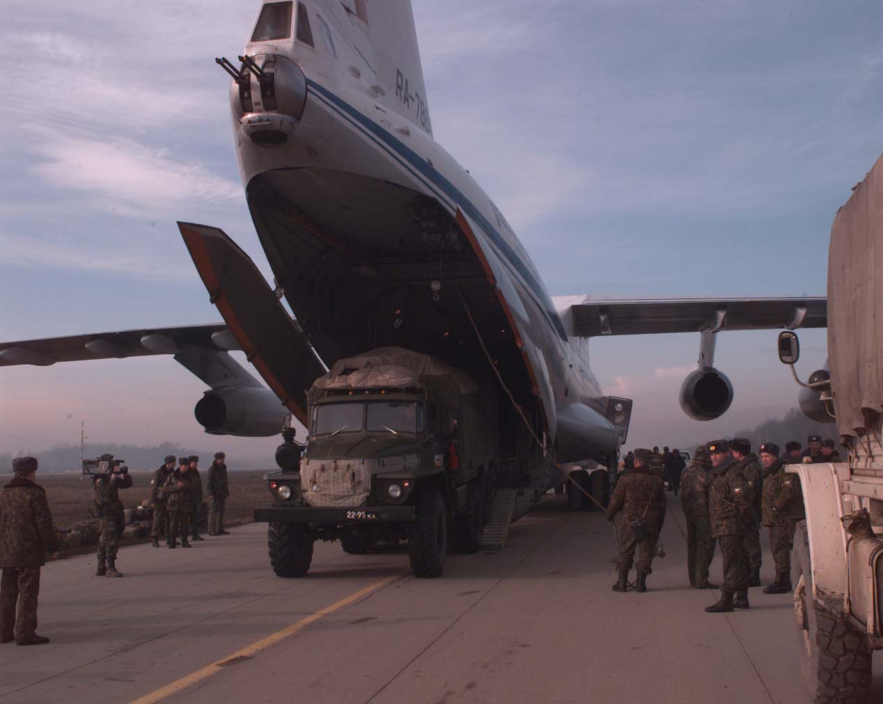 January 19 The first Russian vehicle rolls off a Russian IL-76 in Tuzla after being transported from Russia to join the NATO peacekeeping operation in Bosnia. Senior Airman Ken Bergmann U.S. Army Maj. Gen. William Nash, 1st Armored Division commander, and a Russian officer speak with the press after lead elements of a Russian brigade arrive at Tuzla Air Base, Bosnia.