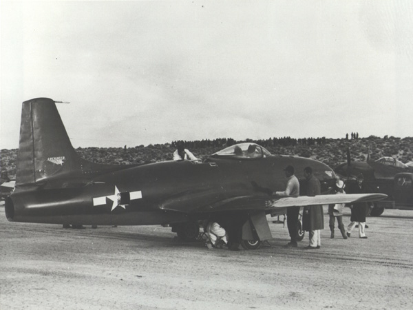 Of all the tests conducted at Muroc (later Edwards AFB) during the war years, none was more important than those which got underway on January 8, 1944, as a small group of people assembled on the lake bed to witness the first flight of a new single-engine jet prototype. Brainchild of Clarence L. "Kelly" Johnson, the top secret XP-80 had been designed and built by Lockheed's fledgling "Skunk Works" in just 143 days. est pilot Milo Burcham put on an impressive display that morning, as the aircraft accelerated to a speed of 490 mph and, during official Army Air Force (AAF) acceptance tests flown by Maj. Wally Lein just over a month later, the XP-80 became the first American airplane to exceed 500 mph in level flight. Nicknamed "Lulu Belle" by Lockheed personnel, the small airplane was configured with a British-built DeHavilland Halford H-1B centrifugal-flow turbojet which provided 2,460 pounds of static thrust. |
