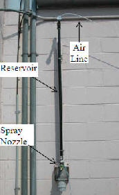 To help assess the hazards posed by the TKS anti-icing fluid when stored under pressure in the presence of hot equipment, the fluid was sprayed into small droplets and exposed to an ignition source at ambient pressure and temperature conditions. The fluid was spayed by pressurizing a reservoir to 20 and 40 psig and feeding the fluid through a misting nozzle. The outside air temperature was between 70° and 90°F, and the air pressure was approximately standard ambient sea level pressure (29.92 inches Hg). The ability to ignite the mist when exposed to a flame and a spark was examined as well as the ability of the mist to hold a flame without an ignition source and flashback to the spray nozzle. The behavior of any observed fire was recorded on videotape and characterized.  Figure 1 shows the hot-surface test apparatus and the spray flammability tester.