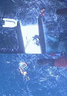 The helicopter arrived on scene first and started following the radio beacon signal from the catamaran?s EPIRB.  The helicopter located the overturned boat, its hull blending in with the white-capped waves, and descended to a hover over the vessel where the crew spotted three people clinging to the hull as waves washed over the boat. ?Another key to finding this crew was that they stayed with their vessel.  It is much easier to find a boat, even an overturned boat, in the ocean than an individual person,? said Lt.j.g. Bernie Garrigan, the Dolphin helicopter co-pilot.