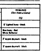 (7j) Used for the following specific information, plus any other useful details: a. buoys - size, shape, color, and reflective material used; b. structures - daymark shape and color; c. fog signal on a buoy or structure - type and model, audible range, and characteristic (number of strokes or blasts, period and blast length).