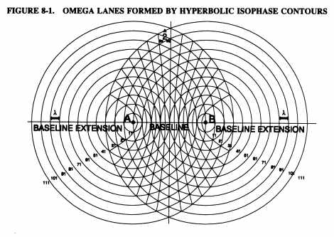 FIGURE 8-1. OMEGA LANES FORMED BY HYPERBOLIC ISOPHASE CONTOURS