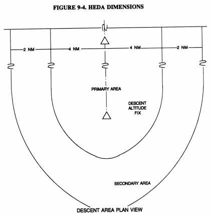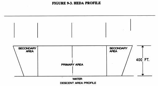 g. HEDA Procedures and Requirements. Prior to granting authorization, the CHDO or jurisdictional FSDO will coordinate with a flight inspection procedures specialist to determine if the proposed HEDA is clear of obstructions and that positive course guidance is available for the entire route, including descent to the lowest authorized altitude (LAA). All required flight and navigation equipment must be installed and operative to utilize the 400-foot minimum. Figures 9-1 and 9-2 portray the enroute dimensions contained in FAA Order 8260.3, "U.S. Standards for Terminal Instrument Procedures," that should be used to develop the primary and secondary areas for HEDA use. HEDA's have the profile of Figure 9-3 and the dimensions of the plan view as shown in Figure 9-4. The descent area begins at the descent fix and ends at the descent altitude fix. This area must be located over water and be free of obstacles.